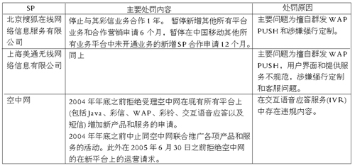 一方面是信息產(chǎn)業(yè)部管理手段的加強(qiáng),另一方面則是運(yùn)營商管理方式的嚴(yán)肅,從表格中可以看出,中國移動對SP的懲罰已經(jīng)具有相當(dāng)?shù)牧Χ取T跒樵鲋硺I(yè)務(wù)打造了相關(guān)的業(yè)務(wù)品牌之后,整個產(chǎn)業(yè)鏈條的控制權(quán)目前還是掌握在運(yùn)營商手中。
