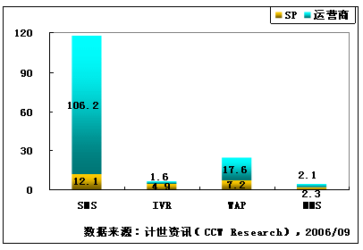 計世資訊(CCW Research)數(shù)據(jù)顯示,2006年第二季度,移動增值業(yè)務(wù)市場規(guī)模達到182億元人民幣,移動增值業(yè)務(wù)指依托移動通信網(wǎng)絡(luò)所提供的基本服務(wù)而開展的增值數(shù)據(jù)業(yè)務(wù)服務(wù),市場規(guī)模包括移動運營商和服務(wù)提供商(SP)收入。其中SMS、IVR、CRBT、WAP和MMS市場規(guī)模分別為118.3、6.5、15.7、24.8和4.4億元人民幣,其他移動增值業(yè)務(wù)市場規(guī)模12.3億元人民幣,包括JAVA、BREW、移動定位等業(yè)務(wù)。