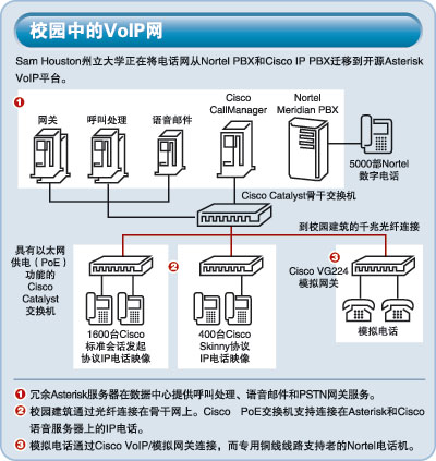 SHSU到目前為止已經(jīng)將1600 部IP電話由Cisco CallManager遷移到Asterisk上,后者運(yùn)行IETF標(biāo)準(zhǔn)的SIP。Asterisk的功能將分布在幾臺冗余Dell服務(wù)器上:其中兩臺作為冗余PSTN網(wǎng)關(guān);
