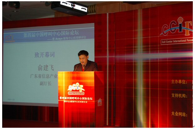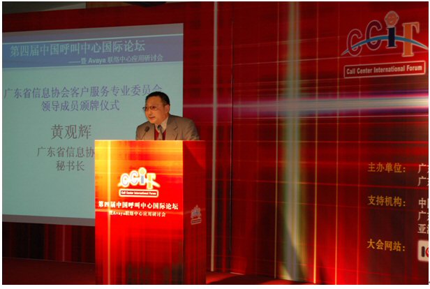 由廣東省信息協(xié)會(huì)、廣東省電子商務(wù)協(xié)會(huì)聯(lián)合主辦,廣東省信息協(xié)會(huì)客戶服務(wù)專業(yè)委員會(huì)、廣州市品派文化傳播有限公司策劃承辦,AVAYA公司總協(xié)辦的第四屆中國(guó)呼叫中心國(guó)際論壇于2007年1月23日在廣州亞洲國(guó)際大酒店隆重舉行,廣東省信息產(chǎn)業(yè)廳副廳長(zhǎng)俞建飛出席會(huì)議并致開(kāi)幕詞。會(huì)上,廣東省信息協(xié)會(huì)秘書(shū)長(zhǎng)黃觀輝、AVAYA公司銷售總經(jīng)理?xiàng)畛、民生銀行電子銀行部華南運(yùn)營(yíng)中心總經(jīng)理李濤、網(wǎng)易客戶服務(wù)部總監(jiān)張?jiān)频确謩e做了主題發(fā)言。來(lái)自全國(guó)各地300多位企業(yè)管理人員參加了本次論壇。