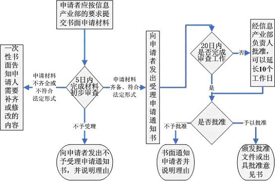 信息產(chǎn)業(yè)部或者省、自治區(qū)、直轄市通信管理局應(yīng)當(dāng)自發(fā)出受理申請(qǐng)通知書(shū)之日起20個(gè)工作日內(nèi)完成審查工作,作出批準(zhǔn)或不予批準(zhǔn)的決定。20個(gè)工作日內(nèi)不能做出決定的,經(jīng)信息產(chǎn)業(yè)部或者省、自治區(qū)、直轄市通信管理局負(fù)責(zé)人批準(zhǔn),可以延長(zhǎng)10個(gè)工作日,并將延長(zhǎng)期限的理由告知申請(qǐng)人。予以批準(zhǔn)的,出具正式批準(zhǔn)文件;不予批準(zhǔn)的,書(shū)面通知申請(qǐng)人并說(shuō)明理由。