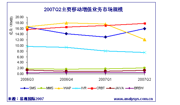 易觀國際研究表明,2007年第2季度移動(dòng)增值服務(wù)整體市場(chǎng)規(guī)模為57.42億元,同比下降2.33%。其中彩鈴業(yè)務(wù)收入居首位達(dá)17.75億元。