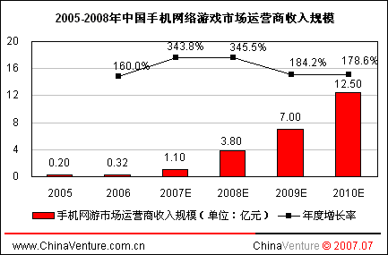 創(chuàng)業(yè)投資研究機構ChinaVenture近日發(fā)布了《ChinaVenture 2007年中國手機網游行業(yè)投資價值研究報告》,該報告顯示,2007年隨著手機網游用戶數(shù)量和產品大規(guī)模增加,手機網游市場運營收入將達1.10億人民幣。2008年仍將呈現(xiàn)高速增長,達3.80億元人民幣。(見圖一)