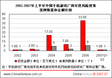 ChinaVenture分析師指出,除2006年觸通安騰和掌上明珠依靠手機網游業(yè)務獲得數(shù)百萬美元投資外,其余企業(yè)獲融資原因均為投資商看好手機單機游戲業(yè)務。2007年之前由于手機網游市場規(guī)模過小,加上無線網絡環(huán)境制約,風險投資商大多抱以觀望態(tài)度。