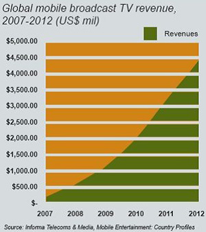 根據(jù)市場(chǎng)研究公司Informa Telecoms &Media的調(diào)查數(shù)據(jù)顯示,移動(dòng)電視市場(chǎng)在韓國(guó)、意大利和美國(guó)市場(chǎng)帶動(dòng)下,將在2007年達(dá)到美金2.19億元;至2012年,移動(dòng)電視市場(chǎng)預(yù)計(jì)能產(chǎn)生美金44億元的收益,而美國(guó)將成為最大的單一市場(chǎng),占有全球20%的收益。Informa甚至認(rèn)為在2009年,美國(guó)就可超越韓國(guó),成為移動(dòng)電視最大的單一市場(chǎng)。