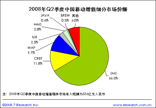 推薦本文根據(jù)艾瑞咨詢最新發(fā)布的《2008年第二季度中國 移動(dòng)增值市場(chǎng)監(jiān)測(cè)報(bào)告》的相關(guān)數(shù)據(jù)顯示,08年第二季度中國移動(dòng)增值服務(wù)市場(chǎng)的收入規(guī)模為336億元人民幣,其中傳統(tǒng)增值業(yè)務(wù)占據(jù)大部分市場(chǎng)份額,尤其是短信業(yè)務(wù),在增值服務(wù)市場(chǎng)上的份額達(dá)到了66.3%.預(yù)計(jì)隨著電信業(yè)重組的逐步完成及3G新業(yè)務(wù)的推出將對(duì)增值服務(wù)市場(chǎng)的發(fā)展起到積極的推動(dòng)作用,傳統(tǒng)短信業(yè)務(wù)的市場(chǎng)份額將會(huì)緩慢下降。