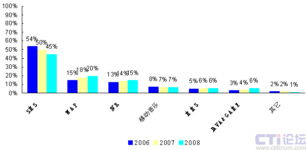 圖1 2006~2008年中國移動數(shù)據(jù)業(yè)務市場結(jié)構(gòu)(單位:%)