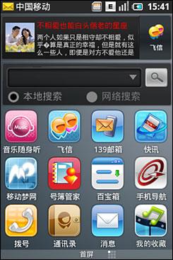 在第一屏的上端,是中國移動的“快訊”欄目條和飛信登錄框,這讓整個手機(jī)看上去極具“中國移動特色”,“快訊”和“飛信”的下面是Google的搜索框,搜索框有兩個選擇,分別是本地搜索和網(wǎng)路搜索。