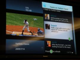 在使用電視窗件時(shí),電視機(jī)屏幕將被分為左右兩塊,Twitter消息顯示在其中一個(gè)屏幕中。這一應(yīng)用在觀看重大事件或者體育賽事時(shí)可以帶來非常精彩的體驗(yàn)。比如觀看紐約楊基隊(duì)的一場棒球比賽,用戶可以同時(shí)閱讀洋基隊(duì)有關(guān)的Twitter短消息。