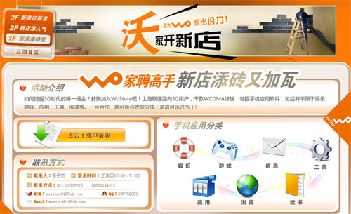 上海聯(lián)通在該網(wǎng)站特別設(shè)定“我家開新店”版塊,為新店征名,同時尋求軟件開發(fā)伙伴,并稱包括不限于娛樂、游戲、應(yīng)用、工具、閱讀等類別,一旦合作就可參與收益分成,最高可達70%。