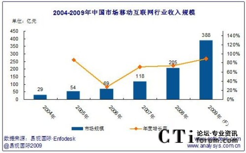 2009年中國(guó)市場(chǎng)移動(dòng)互聯(lián)網(wǎng)行業(yè)收入規(guī)模將達(dá)388億,年增長(zhǎng)率達(dá)111.78%。