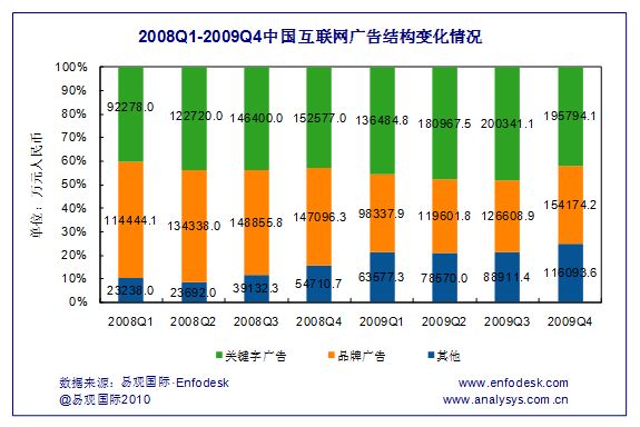 品牌廣告則繼續(xù)保持上升趨勢,2009年第4季度,其市場規(guī)模達到15.4億元,環(huán)比增長21.8%,同比小幅上升4.8%。增長來源主要是快消品、互聯(lián)網產品及服務以及汽車、通訊行業(yè)等。