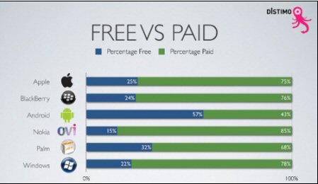 業(yè)內人士認為,之所以出現這種情況,或許是因為谷歌最早只面向免費應用開放Android應用商店,后來才允許開發(fā)人員推出付費應用。蘋果和黑莓的免費應用比例比較接近,分別為25%和24%。此外,Palm的這一比例為32%,Windows