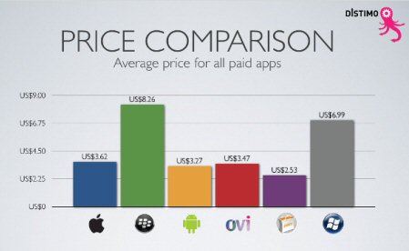 Mobile的應用平均售價也較高,為6.99美元,諾基亞Ovi為3.47美元,Palm僅為2.53美元。