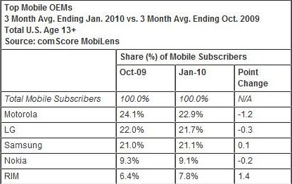 3月11日消息,據(jù)國外媒體報(bào)道,全球IT信息服務(wù)提供商comScore公司最近發(fā)布了一項(xiàng)2009年第四季度(2009年10月至2010年1月)美國手機(jī)市場調(diào)查報(bào)告。這份報(bào)告對手機(jī)原配件生產(chǎn)商(OEMs)及智能手機(jī)操作系統(tǒng)平臺做了相關(guān)的行業(yè)排名,排名依據(jù)為美國市場13歲以上手機(jī)用戶群數(shù)據(jù)的統(tǒng)計(jì),以及用戶手機(jī)使用行為的調(diào)查數(shù)據(jù)。一月份報(bào)告顯示摩托羅拉以22.9%的市場份額占據(jù)了第一位。RIM公司則占據(jù)著智能手機(jī)市場43%的市場份額,競爭優(yōu)勢明顯。