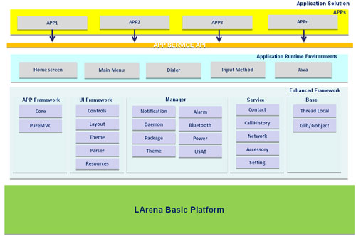LARENA3.0是聯(lián)芯科技自主研發(fā)的高度可配置、可擴(kuò)展、開(kāi)放性的業(yè)內(nèi)主流手機(jī)應(yīng)用平臺(tái),它集通信、多媒體和移動(dòng)互聯(lián)網(wǎng)功能于一體,實(shí)現(xiàn)了完整的應(yīng)用生命周期管理和動(dòng)態(tài)加載能力,充分體現(xiàn)了TD-SCDMA特有創(chuàng)新技術(shù),并支持多種業(yè)務(wù)能力,提供豐富的工具套件。