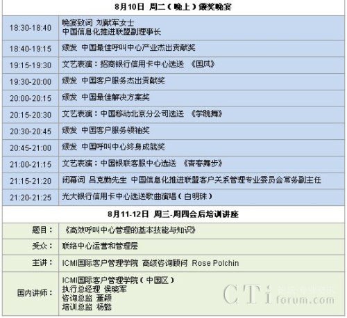 CTI論壇(ctiforum)8月3日消息(記者 潘婷婷):“第八屆中國(guó)呼叫中心產(chǎn)業(yè)高峰論壇暨第八屆中國(guó)最佳呼叫中心及最佳管理人頒獎(jiǎng)大會(huì)”定于2010年8月10日在上海國(guó)際貴都大飯店召開(kāi)。此次大會(huì)是由中國(guó)信息化推進(jìn)聯(lián)盟客戶(hù)關(guān)系管理專(zhuān)業(yè)委員會(huì)主辦,ICMI國(guó)際客戶(hù)管理學(xué)院(中國(guó)區(qū))承辦。通過(guò)本次大會(huì),與會(huì)者將獲得中國(guó)最佳呼叫中心實(shí)踐經(jīng)驗(yàn)和最佳解決方案的分享,與業(yè)界精英共話(huà)呼叫中心和客戶(hù)關(guān)系管理的未來(lái)。