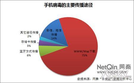 感染途徑方面,《2010年中國大陸地區(qū)手機(jī)安全報(bào)告》指出,據(jù)網(wǎng)秦“云安全”數(shù)據(jù)分析中心統(tǒng)計(jì),當(dāng)前通過手機(jī)訪問wap和www網(wǎng)站感染病毒的比率達(dá)75%;通過短信、彩信感染病毒的比率占14%;通過藍(lán)牙傳輸方式感染病毒的比率占6%;通過存儲(chǔ)卡等途徑感染病毒的比率占3%;另外2%的用戶則是被其它傳播途徑的病毒感染。其中聯(lián)網(wǎng)感染病毒的機(jī)率最大,成為用戶面臨的最主要威脅。