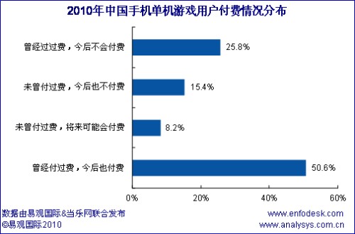 根據(jù)調(diào)研顯示,手機(jī)單機(jī)游戲中,有76.4%的用戶都有過付費經(jīng)歷,但有25.8%的用戶表示今后將不在付費,出現(xiàn)這種現(xiàn)象原因有多種,主要還是存在損害用戶行為經(jīng)常發(fā)生,外加上眾多與PC交叉用戶的涌入,而這些用戶中免費的、盜版的、破解的成為他們的首選,因此預(yù)計未來單機(jī)游戲的付費比例還將下降。