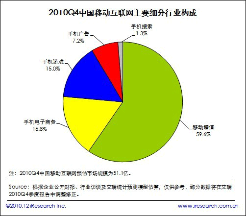 根據(jù)艾瑞咨詢即將發(fā)布的2010年第四季度中國移動互聯(lián)網(wǎng)市場監(jiān)測數(shù)據(jù)顯示,2010Q4中國移動互聯(lián)網(wǎng)市場整體規(guī)模達到51.1億,同比增長19.8%,環(huán)比增長20.3%。艾瑞咨詢分析認為,本季度電信運營商對計費通道治理開始收尾,移動增值市場整體復蘇。同時手機電子商務、手機游戲業(yè)務領域取得良好市場表現(xiàn),受手機應用商店、位置簽到服務等新型手機業(yè)務創(chuàng)新的帶動,移動互聯(lián)網(wǎng)規(guī)模總體攀升,投融資比重增加。