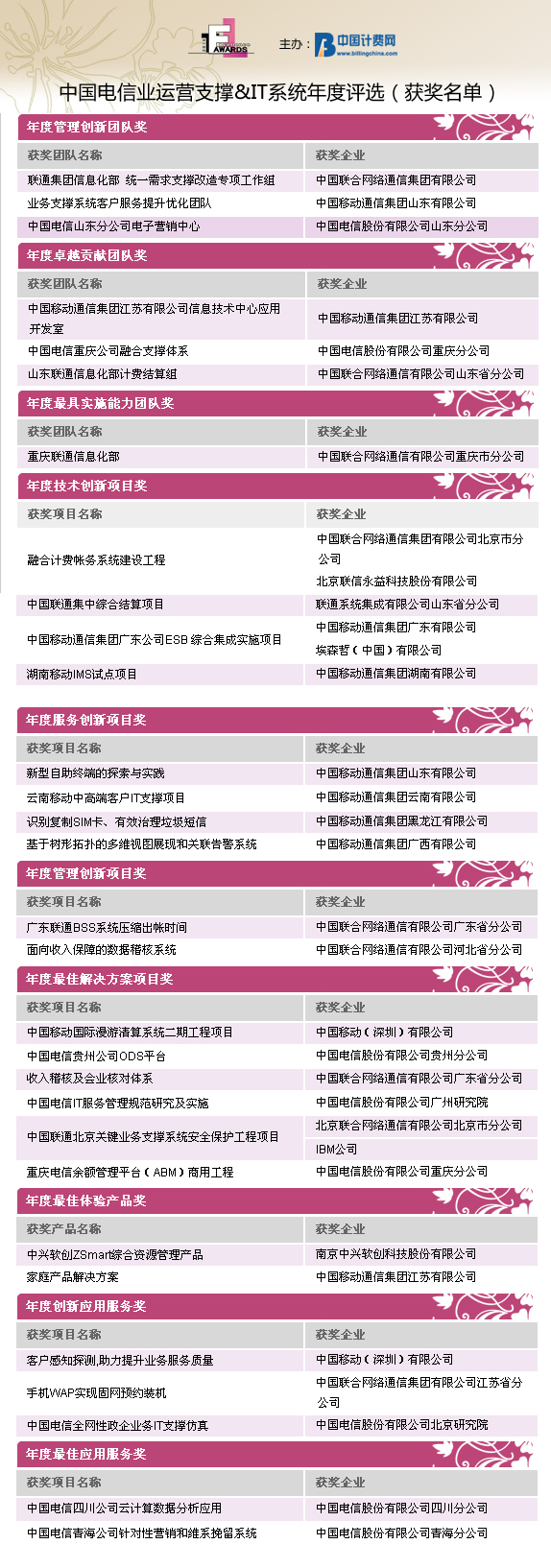 由中國計費網(wǎng)(www.billingchina.com)主辦的“Awards2010”第四屆中國電信業(yè)運營支撐&IT系統(tǒng)年度評選活動的結(jié)果于2011年元月31日隆重揭曉。自2010年12月1日評選活動正式啟動以來,歷時兩個月,來自國內(nèi)運營商集團、省級公司、IT產(chǎn)品與服務(wù)提供商的42家企業(yè)的優(yōu)秀產(chǎn)品、項目和團隊共計70份參評項目入圍評選。經(jīng)過全面征集、選拔、初審以及評委團的嚴格評審,評選結(jié)果已經(jīng)公示。在30位來自運營商IT支撐、業(yè)務(wù)和服務(wù)部門的威權(quán)評委們的認真評審后,共有27家企業(yè)分別獲得了30個Awards2010的團隊/項目/產(chǎn)品/應用服務(wù)的榮譽桂冠。