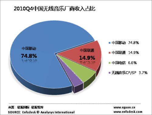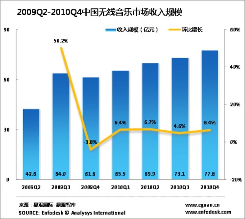 根據(jù)Enfodesk易觀智庫最新發(fā)布的數(shù)據(jù)顯示,2010年第4季度中國無線音樂收入保持穩(wěn)定的增長,達(dá)到74.13億元,環(huán)比增長4.58%。