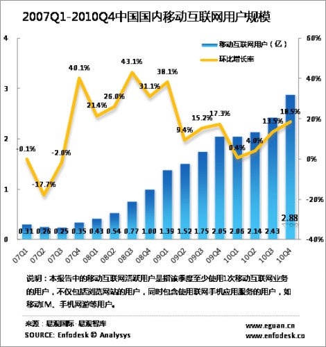 據(jù)Enfodesk易觀智庫最新發(fā)布的數(shù)據(jù)顯示,2010年第4季度中國(guó)國(guó)內(nèi)移動(dòng)互聯(lián)網(wǎng)用戶規(guī)模達(dá)2.88億人,環(huán)比增長(zhǎng)18.52%,相比去年同期呈現(xiàn)41.48%的增長(zhǎng)速度。