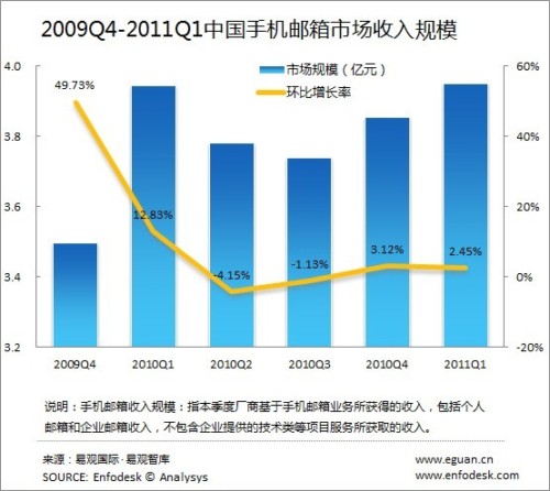 2011年Q1中國手機郵箱市場收入規(guī)模達(dá)3.95億元