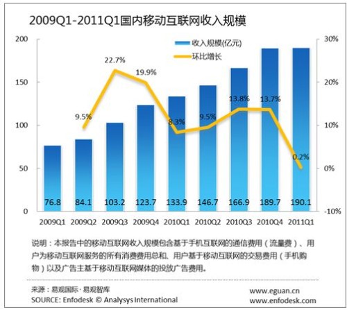 2011年第1季度國內移動互聯(lián)網(wǎng)收入達190億元