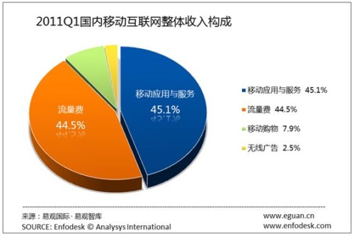 從2011年第1季度移動互聯(lián)網(wǎng)收入構成,我們發(fā)現(xiàn)移動應用與服務仍然是主要營收,占總體市場的45.13%。而流量費依然占據(jù)44.45%的份額。而移動購物,無線廣告營收占比增長有限,分別占7.89%和2.52%。