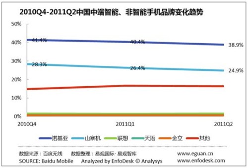 2011年Q2Android手機(jī)繼續(xù)擠占諾基亞及山寨機(jī)份額