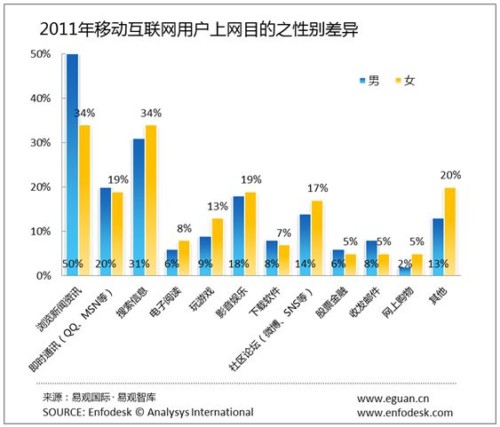 從用戶性別角度來看,男性用戶在瀏覽新聞資訊、股票金融、收發(fā)郵件上的使用上明顯高于女性用戶,與此同時(shí)及時(shí)通訊、社區(qū)論壇、影音娛樂和玩游戲上女性用戶的青睞度更高。