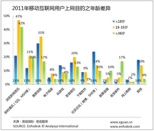 從年齡角度來看,19-35歲的用戶瀏覽新聞、資訊和即時(shí)通訊是手機(jī)上網(wǎng)的主要目的,35歲以上用戶使用移動(dòng)互聯(lián)網(wǎng)的首要目的是瀏覽新聞資訊,即時(shí)通訊需求相較低于35歲用戶銳減。19歲以下用戶最主要使用移動(dòng)互聯(lián)網(wǎng)目的在于即時(shí)通訊,其次在于玩游戲。