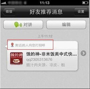 最近,網(wǎng)絡上流傳著這樣一幅截圖:一家叫“餓的神”的快餐店在午間向附近的人打招呼,以宣傳自己的快餐生意,乍一看這種形式,簡直是超越了空間的電子傳單啊?磥砦⑿胚@種交友利器,已經(jīng)突破了傳統(tǒng)交流工具的定義,開始向更寬的領域延伸。