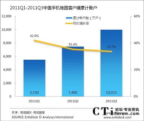 2011年第3季度中國手機(jī)地圖客戶端累計(jì)帳戶過億