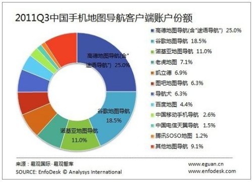 谷歌:以18.5%的綜合份額占據(jù)中國手機(jī)地圖導(dǎo)航客戶端市場排名次席。其中,谷歌地圖仍舊以27%的份額占據(jù)手機(jī)地圖客戶端市場第一的位置,但因為其經(jīng)營策略和中國國內(nèi)政策等原因,谷歌地圖在內(nèi)地行貨版安卓手機(jī)中普遍被閹割,在一定程度上影響了谷歌地圖市場占有率的進(jìn)? 徊教嶸。链撯,业娇N氈樵げ餛還雜惺只贗疾方魑筆旨隊τ迷趇Phone5中推出,這有可能撼動谷歌地圖在IOS平臺的統(tǒng)治地位。