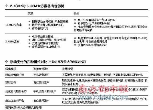 對此,國金證券發(fā)布了一份研究報告稱,相對于13 .56MHz方案而言,2.4GHz方案在推廣上有先天的優(yōu)勢。畢竟13.56M H z方案必須對手機(jī)重新設(shè)計,需要等待手機(jī)產(chǎn)業(yè)鏈對13.56M H z的逐步支持,時間周期較長;同時,更換13.56M H z手機(jī)帶來的重置成本無論是由用戶承擔(dān)還是由運營商承擔(dān)都是一筆高額的費用,推廣難度較高。而2.4G H z方案僅需更換SIM卡便可完成對手機(jī)的改造,不用等待終端產(chǎn)業(yè)鏈的成熟;同時改造成本低,便于運營商進(jìn)行促銷推廣。