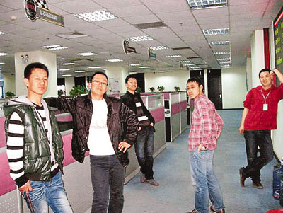圖:李明磊(左一)與同事們堅守在呼叫中心的崗位上 想多賺錢助姐結婚