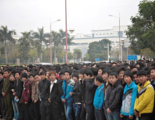 在一個(gè)周一上午,約3000名外來(lái)工人在深圳的富士康招聘中心門(mén)前,希望獲得在富士康的工作機(jī)會(huì)。