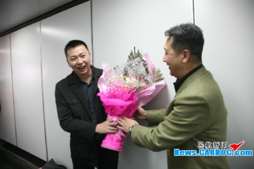 圖1:南航新疆分公司市場(chǎng)銷售部領(lǐng)導(dǎo)迎接“南航優(yōu)秀青年勞務(wù)工”李江濤載譽(yù)歸來(lái)