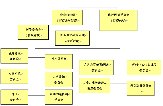 。。對(duì)于呼叫中心建設(shè)項(xiàng)目實(shí)施的規(guī)劃是一個(gè)需要付出巨大心血與努力的階段,這個(gè)階段需要企業(yè)或組織機(jī)構(gòu)所有人員的廣泛參與和專家意見。對(duì)于呼叫中心運(yùn)營(yíng)的規(guī)劃,相對(duì)與呼叫中心建設(shè)項(xiàng)目而言則顯得有些"特殊",它意味著整個(gè)呼叫中心建設(shè)項(xiàng)目團(tuán)隊(duì)不可能有全部的時(shí)間花費(fèi)在運(yùn)營(yíng)規(guī)劃議題上。因此,我們可以將全部項(xiàng)目規(guī)劃工作與任務(wù)拆分成若干個(gè)規(guī)劃細(xì)項(xiàng),這將保證有較強(qiáng)的可操作性。我們建議采取的方式是將整個(gè)項(xiàng)目實(shí)施規(guī)劃團(tuán)隊(duì)拆分成負(fù)責(zé)各個(gè)專項(xiàng)實(shí)施的小組委員會(huì)或附屬委員會(huì)。這些小組委員會(huì)將集中關(guān)注各自特定的項(xiàng)目實(shí)施上,當(dāng)有需要時(shí),與其他各小組進(jìn)行交流與溝通,并在相關(guān)問題上達(dá)成一致。按照以上項(xiàng)目組織管理架構(gòu)其目的是,在項(xiàng)目實(shí)施的關(guān)鍵環(huán)節(jié)和領(lǐng)域,能產(chǎn)生出更具深度的規(guī)劃方案。這樣操作同時(shí)可以使更多的人員參與進(jìn)來(lái),并有利于增強(qiáng)各個(gè)小組的責(zé)任感,有助于項(xiàng)目的成功實(shí)施。以下的項(xiàng)目指導(dǎo)委員會(huì)組織架構(gòu)不是任何呼叫中心建設(shè)項(xiàng)目都能適用的,但是它在某種程度上已經(jīng)為呼叫中心項(xiàng)目規(guī)劃提出了一個(gè)基本方針,按照這個(gè)思路它將保證項(xiàng)目的成功實(shí)施。而對(duì)于規(guī)模較小的呼叫中心項(xiàng)目,以上的組織架構(gòu)成員將扮演多重角色,并負(fù)責(zé)多項(xiàng)任務(wù)項(xiàng)目的實(shí)施。就呼叫中心項(xiàng)目規(guī)劃與實(shí)施團(tuán)隊(duì)而言,應(yīng)由若干個(gè)負(fù)責(zé)不同領(lǐng)域?qū)嵤┑男〗M來(lái)組成,以便確保呼叫中心建設(shè)項(xiàng)目的所有領(lǐng)域,及各個(gè)階段的有效實(shí)施。呼叫中心項(xiàng)目規(guī)劃與實(shí)施組織架構(gòu)請(qǐng)見下圖。