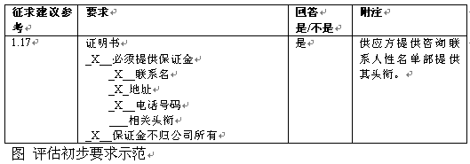 。。在評估的這一部分中通常不給予建議申請的"初步強制性要求"。但是,若不提供基本要求的信息,可能造成停止對某一特定建議評估。圖x中的示范工作表用來檢驗供應方對這些初步要求的回應。