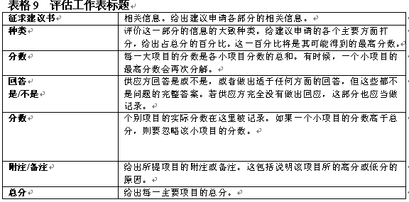 。。在決定了初步要求之后,評估小組應具體地開展評估工作。具體評估的目標是通過給建議書主要方面打分作出評估?梢栽谒愠鼋ㄗh書各方面占總分數(shù)的百分比,如表8中對各方面的總覽。一般在建議書內(nèi)向提供者給出這一信息。