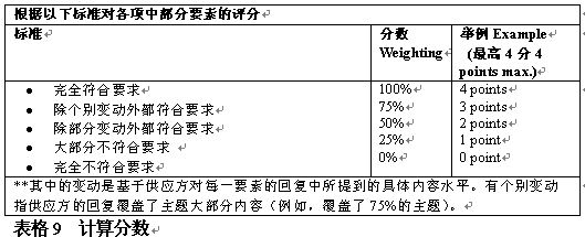 。。評分者應該了解供應方對所提建議申請的回復,從各方面評估該建議符合每一評判標準的情況,相應地給出分數(shù)。根據(jù)每個標準,應在評判過程中分組給出最高分數(shù)。表格9舉例說明了如何對回復打分。.