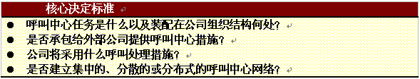 。。當(dāng)一個(gè)公司考慮將呼叫中心納入其整體服務(wù)策略的時(shí)候,在具體步驟開始以前必須作一些基本的決定。重要的是評估該公司當(dāng)前的服務(wù)策略并考慮可能的選擇范圍。本章簡要總結(jié)了建立呼叫中心可能發(fā)生的一些典型的運(yùn)營管理問題。