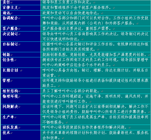 附錄6提供了建議的員工滿意度調(diào)查表?梢宰鳛闇(zhǔn)備制訂呼叫中心使用的版本的起點(diǎn)。在制訂表格時(shí),應(yīng)從所有中心最佳實(shí)踐工作和領(lǐng)導(dǎo)團(tuán)隊(duì)確認(rèn)的其他部門取得評估要素。表格6總結(jié)了呼叫中心員工滿意度調(diào)查應(yīng)包含的主要方面: