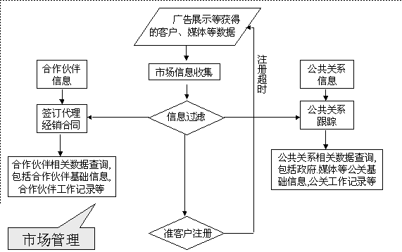 選定適合中小企業(yè)應(yīng)用的CRM軟件 ----啟利CRM ( ChineseCRM.Net ),并由啟利公司負(fù)責(zé)提供實(shí)施服務(wù)。CRM系統(tǒng)的主要模塊包括:市場(chǎng)管理、銷售管理、服務(wù)管理、行政管理,各模塊主要業(yè)務(wù)流程圖如下: