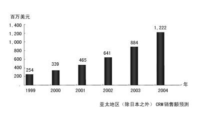 亞太地區(qū)正在成為CRM應(yīng)用軟件的新興市場(chǎng)。1999年亞太地區(qū)CRM市場(chǎng)的年增長(zhǎng)率達(dá)33.5%。其中中國CRM市場(chǎng)是除日本外最具發(fā)展?jié)摿Φ氖袌?chǎng)。預(yù)計(jì)到2004年,中國CRM市場(chǎng)的復(fù)合年平均增長(zhǎng)率為60%。