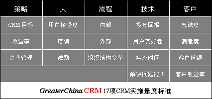 GreaterChinaCRM提出了一組量度標(biāo)準(zhǔn)(五個(gè)范圍共17項(xiàng)),不僅覆蓋了軟件/技術(shù)方面的回報(bào),也綜合包括了策略,人,流程,技術(shù)和客戶。這些量度標(biāo)準(zhǔn)告訴我們應(yīng)當(dāng)如何看待和評(píng)估CRM的實(shí)施。讓我們來(lái)看一下: