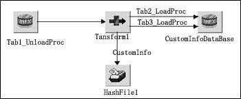 客戶(hù)信息數(shù)據(jù)庫(kù)中的各表以客戶(hù)編碼為關(guān)鍵字進(jìn)行關(guān)聯(lián),客戶(hù)編碼是由客戶(hù)的證件號(hào)碼經(jīng)過(guò)專(zhuān)門(mén)的算法計(jì)算產(chǎn)生的唯一客戶(hù)標(biāo)識(shí)。根據(jù)各個(gè)系統(tǒng)中客戶(hù)數(shù)據(jù)與新系統(tǒng)客戶(hù)信息的對(duì)照關(guān)系我們?cè)O(shè)計(jì)數(shù)據(jù)抽取轉(zhuǎn)換的程序,如圖4所示是一個(gè)DataStage的Job。